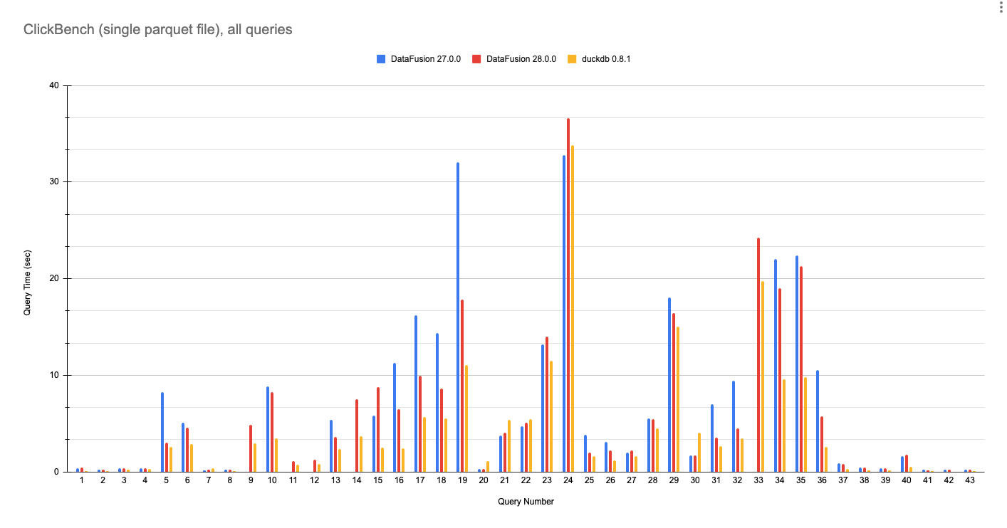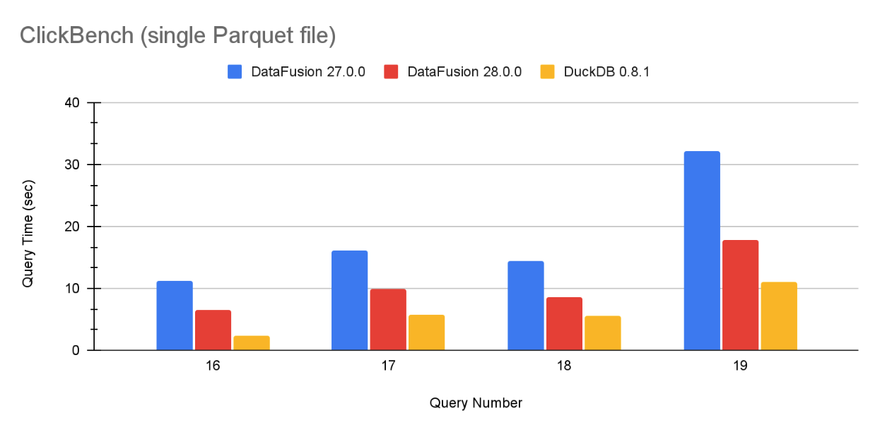 The full results of running the ClickBench queries against the single Parquet file with DataFusion 27.0.0, DataFusion 28.0.0, and DuckDB 0.8.1 are below. These numbers were run on a GCP e2-standard-8 machine with 8 cores and 32 GB of RAM, using the scripts here.