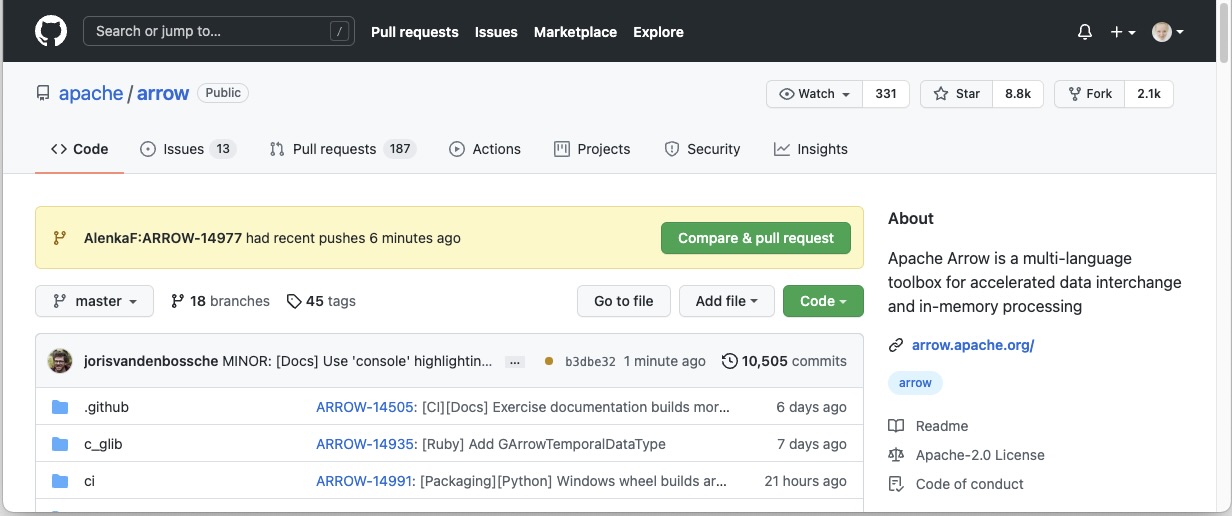 Now we have to go to the Arrow repository on GitHub to create a Pull Request. On the GitHub Arrow page (main or forked) we will see a yellow notice bar with a note that we made recent pushes to the branch ARROW-14977. That’s great, now we can make the Pull Request by clicking on Compare & pull request.