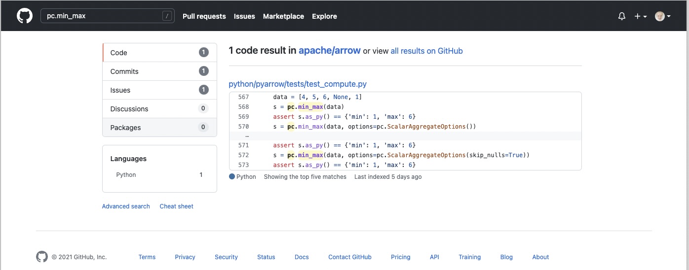 We could try to search for the function reference in a GitHub Apache Arrow repository.#
