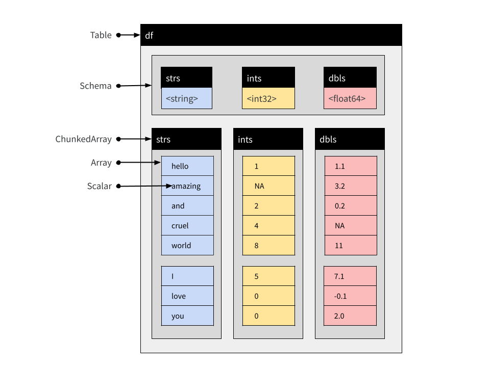 Later in the article we’ll look at each of these in more detail. For now we note that each of these object classes corresponds to a class of the same name in the underlying Arrow C++ library.